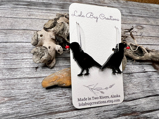 Acrylic raven with red berry earrings with sterling silver ear wires
