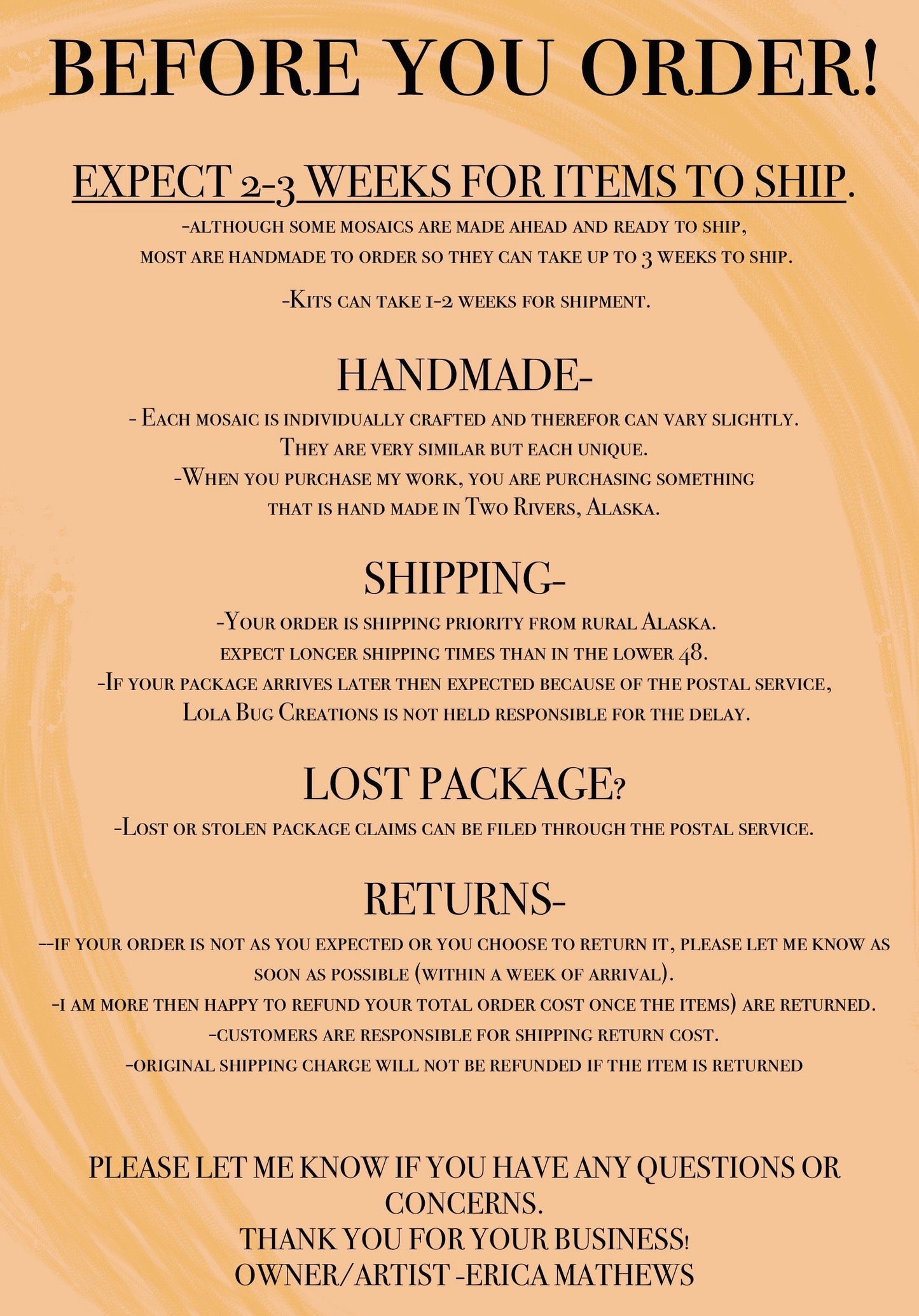 All of my Mosaics are hand made by myself in my home studio in Two Rivers, Alaska. Each mosaic is made with beautiful pieces of stained glass. I hand cut/ chop each piece then place them all by hand on a thin wood backing. They are then set with a dark chocolate or Charcoaled colored grout. Each piece has a hanger placed on the back so they can be used as a piece of wall art. 4” magnets also have a hook on the back to hang on the wall or attach ribbon for an ornament!