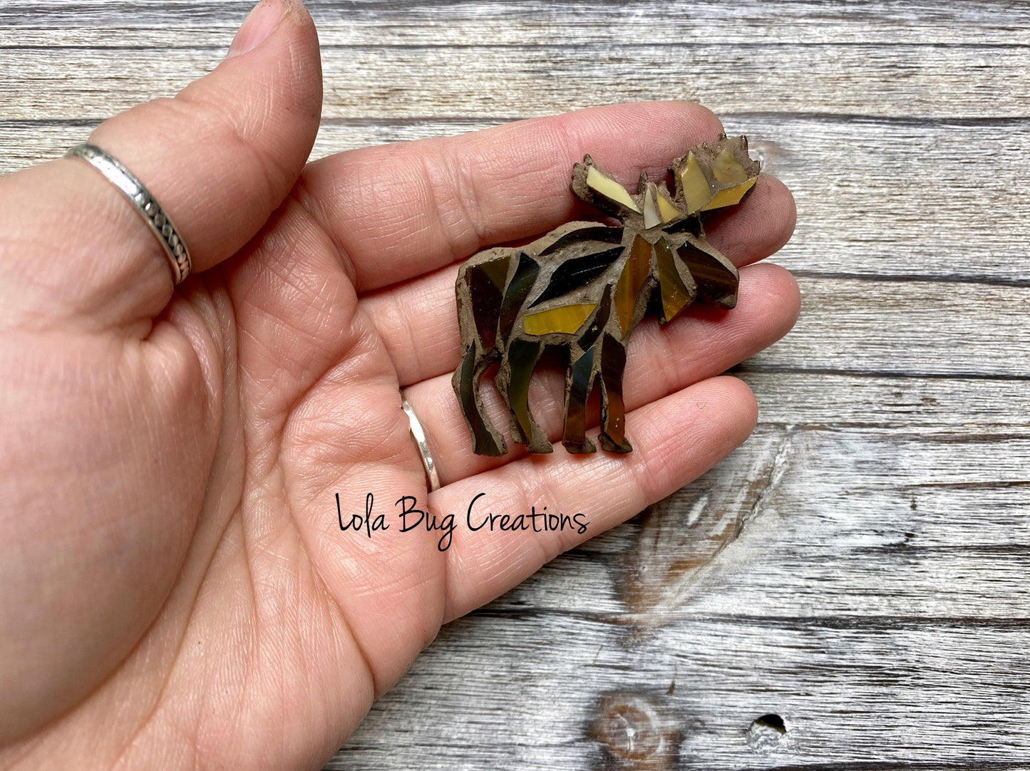 All of my Mosaics are hand made by myself in my home studio in Two Rivers, Alaska. Each mosaic is made with beautiful pieces of stained glass. I hand cut/ chop each piece then place them all by hand on a thin wood backing. They are then set with a dark chocolate or Charcoaled colored grout and attached to a strong magnet.